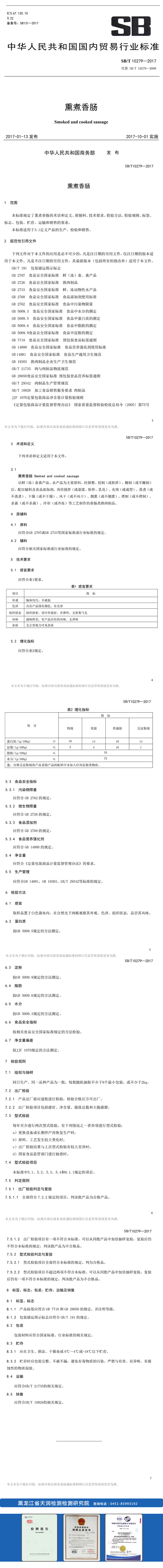 熏煮香肠检测标准