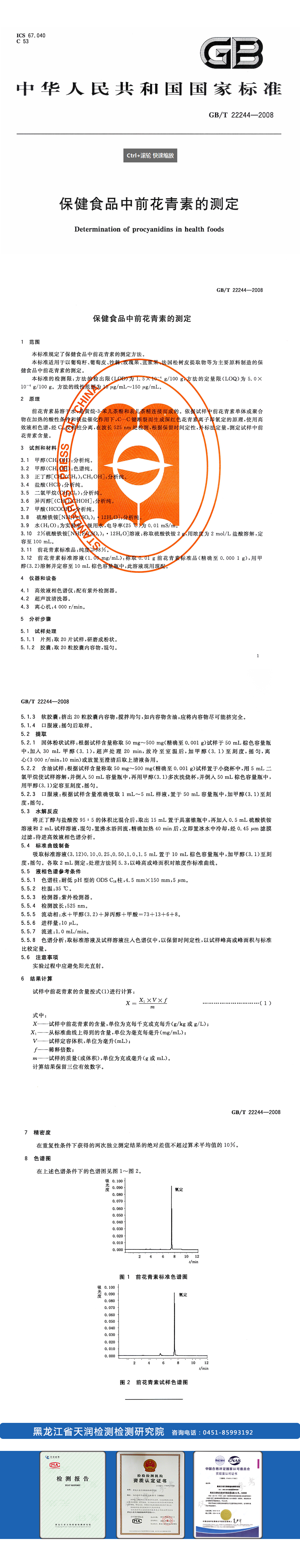 本标准规定了保健食品中前花青素的测定方法。本标准适用于以葡萄籽、葡萄皮、沙棘、玫瑰果、蓝浆果、法国松树皮提取物为主要原料制造的保健食品中的前花青素的测定。