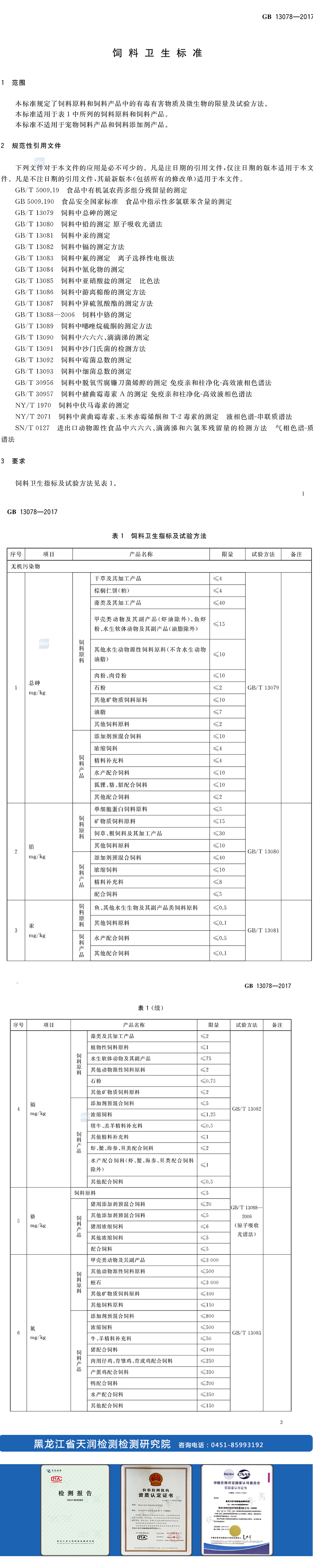 本标准规定了饲料和饲料产品中的有毒有害物质及微生物的限量及试验方法。本标准适用于表1中所列的饲料原料和饲料产品。本标准不适用于宠物饲料产品和饲料添加剂产品。